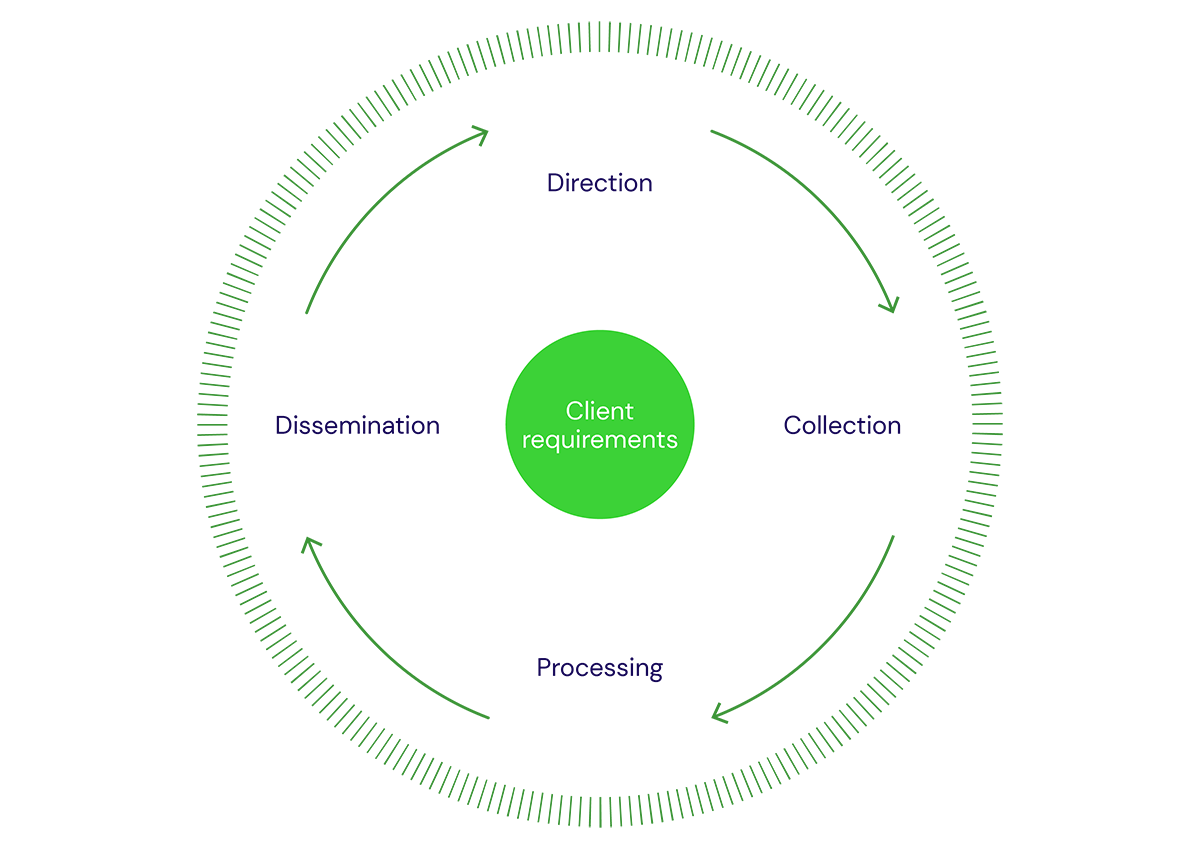 At Horus, we have our own version of this cycle, in which the process starts with the client requirements or input, before following the same pattern – direction, collection, processing (and analysis), and dissemination.